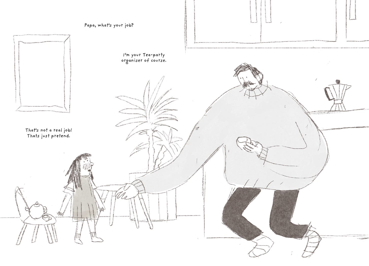 I knew I had to implement these collections into a story, so I came up with the concept of a girl not knowing what her dad does for work so she would be walking around the house looking at his trinkets imagining the things he could be doing while building the character of the absent dad character. While Sketching Dana and Rob (the characters) together I realised that the bond of a father and a daughter interested me much more and the collections could be less of a focus and more of a world-building technique on top of that it would be weird that the girl is left home alone so this story emerged.